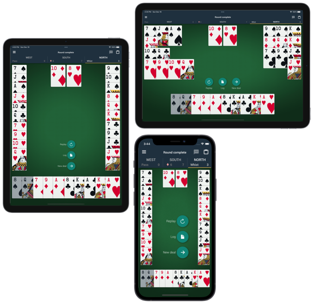 Два, три или четыре игрока; Ленинград, Сочи или Ростов; Различные конвенции для распасов и вистов для самых разборчивых игроков. Десять колод карт, оптимизированы для лучшего отображения на телефонах и планшетах